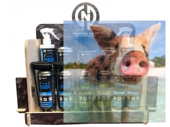 Drewniany stojak na środki czyszczące i konserwujące marki Nanoprotech. Zestaw nie zawiera środków widocznych na zdjęciu.